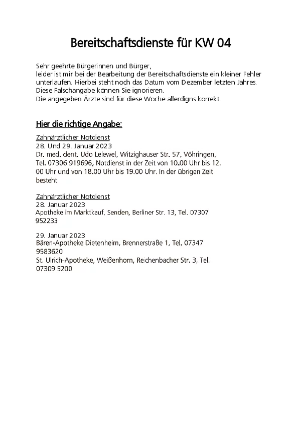 Bereitschaftsdienste für KW 04
