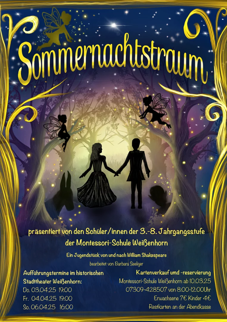 Die Theater-AG der Montessori-Schule Weißenhorn spielt den Sommernachtstraum „von und nach William Shakespeare“ wie es in der Adaption aus der Feder von Barbara Seeliger heißt. Verliebt, verlobt, verwirrt… Das Zauberreich des Elfenkönigs Oberon und seiner stolzen Königin Titania verwandelt sich zum Schauplatz eines Liebesdramas zwischen vier jungen Menschen. Zufällig trifft sich genau dort auch eine Truppe „verblödeter“ Handwerker, um ein Theaterstück für die Hochzeit von Herzog Theseus und seiner angebeteten Hippolyta zu proben. Puck, der freche Diener Oberons und von den Elfen heiß umschwärmter Gigolo, ist stets für einen Schabernack zu haben. Er macht mit seinem Zauberkraut das Chaos perfekt.