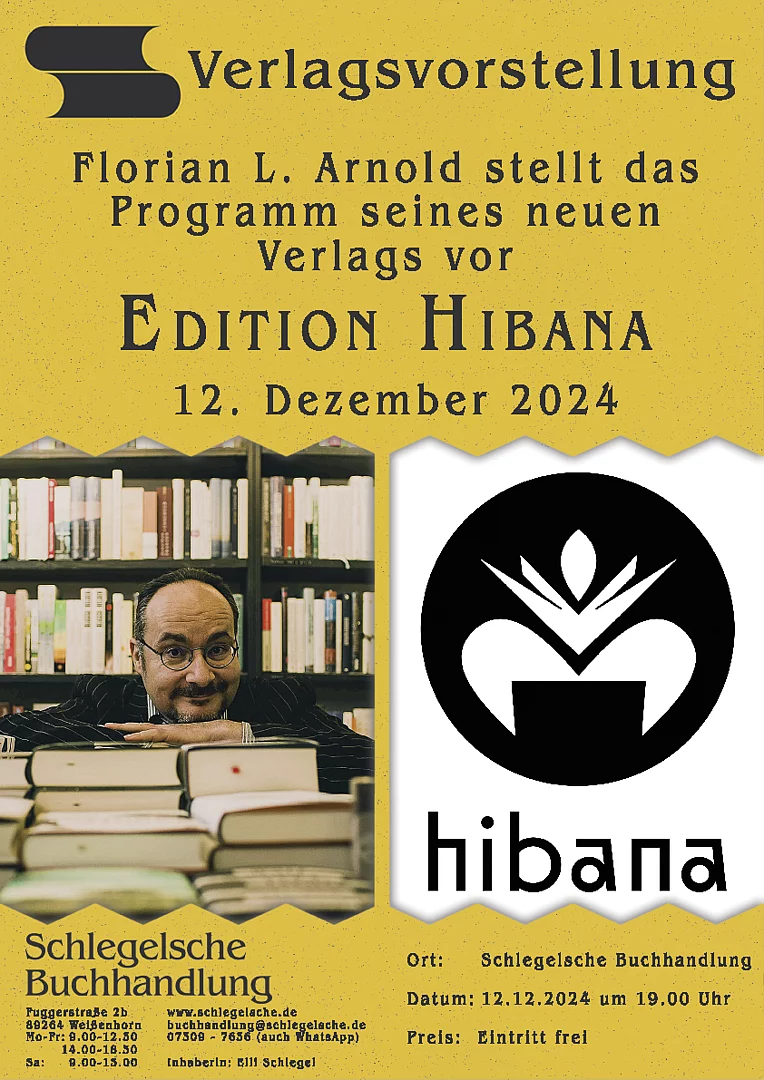 Der Verleger Florian L. Arnold stellt das Programm seines neuen Verlags vor "Edition Hibana". Am 12. Dezember 2024 um 19 Uhr in der Schlegelschen Buchhandlung in Weißenhorn, Eintritt frei.