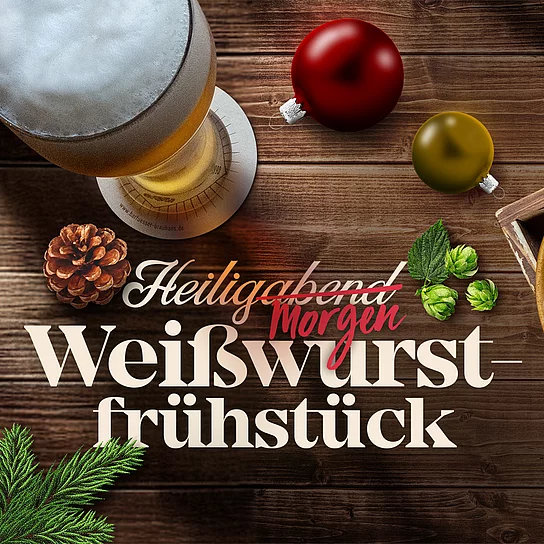 Starte die Weihnachtsfeiertage richtig: Mit einem Weißwurstfrühstück am Heiligmorgen in Deiner Barfüßer Hausbrauerei! 8,90 € für 2 Weißwürste mit Brezel und dem Original Develey süßem Senf. Wir öffnen hierfür extra schon um 10.00 Uhr.