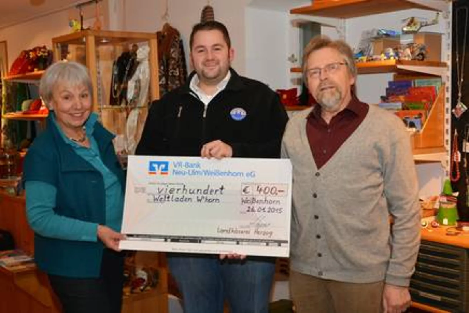 Die beiden Weltladen -Vorsitzenden mit Andreas Herzog bei der Scheckübergabe im Weltladen Weißenhorn